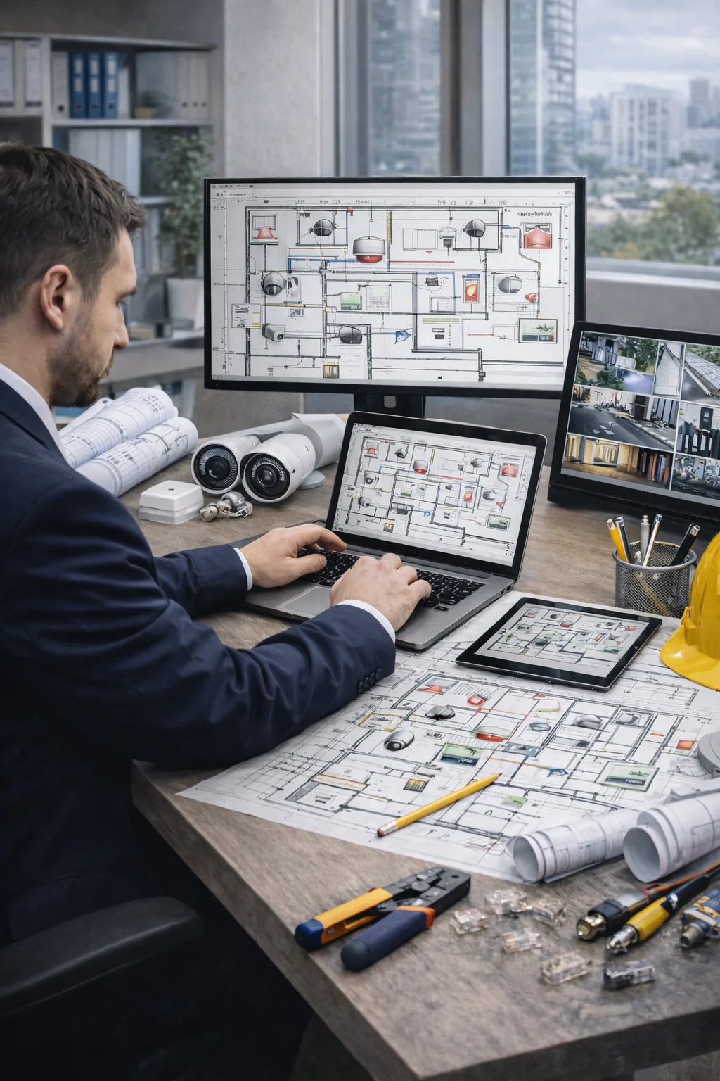 Проектирование помогает заранее «поймать» ошибки: выбрать правильные зоны, определить трассы, подобрать оборудование и согласовать решения с эксплуатацией. Это экономит бюджет и сроки — монтажники работают по понятным схемам, а заказчик понимает, что именно будет установлено.